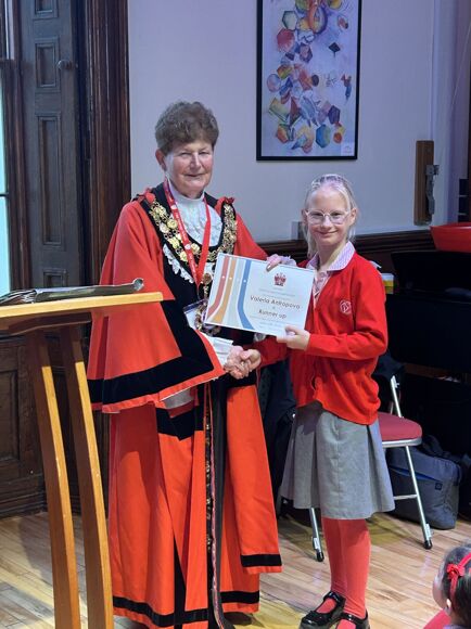 We were delighted to have a visit from Her Worshipful Mayor of Richmond at the end of last term, who announced the winners of the Mayor's Christmas card competition. Girls in Years 5 and 6 designed some beautiful Christmas cards with a 'Twinning' theme to celebrate the reaffirmation of our vows with Konstanz and Fontainebleau. Children from across Richmond borough entered a range of designs, but I am delighted to announce we had two winners, Valeria 6M and Lottie 5F, whose designs were made into Christmas cards, which were sent out by the Mayor.